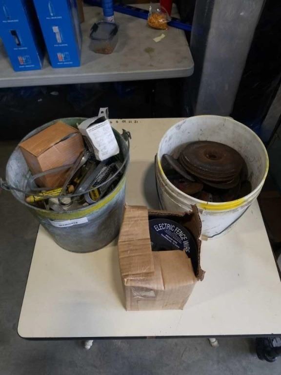 2 PAILS OF SHURLITE SPARK LIGHTERS, WELDING GOGGLES, ELECTRIC FENCE WIRE AND ABRASIVE DISCS