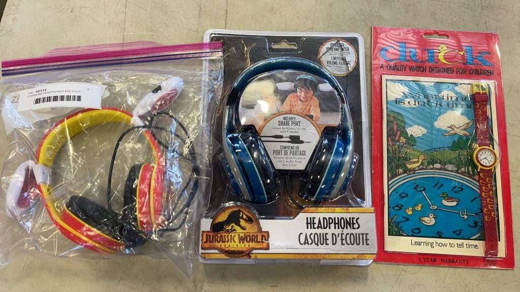 2 PAIRS KID HEADPHONES AND DUCK WATCH