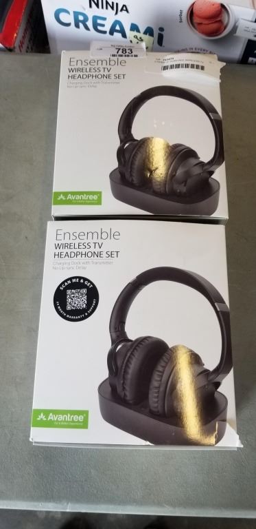 2 PAIRS OF AVANTREE WIRELESS TV HEADSETS, WITH CHARGING DOCK TRANSMITTER