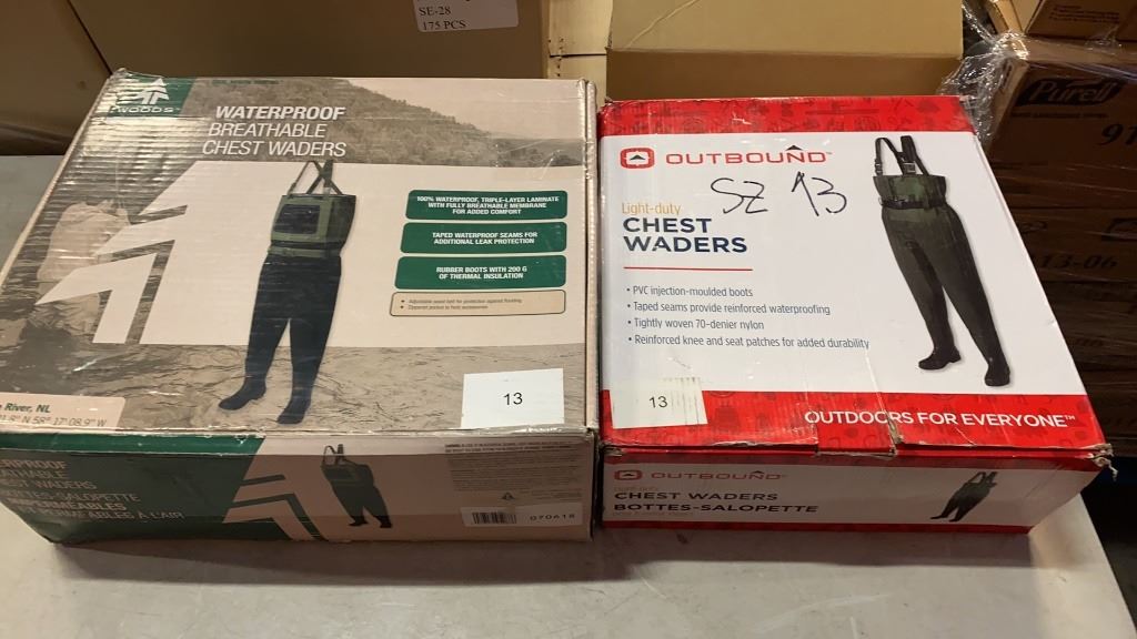 2 PAIRS OF HIP WADERS - SIZE 13 OUTBOUND AND WOODS