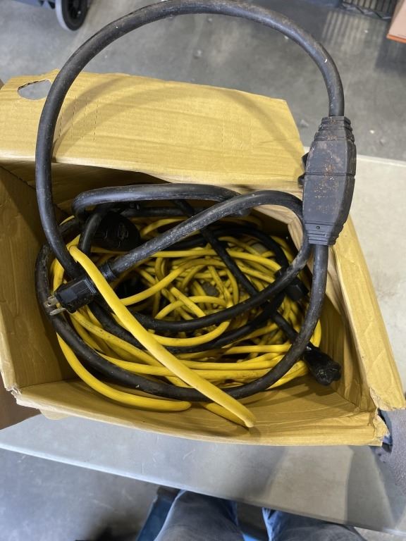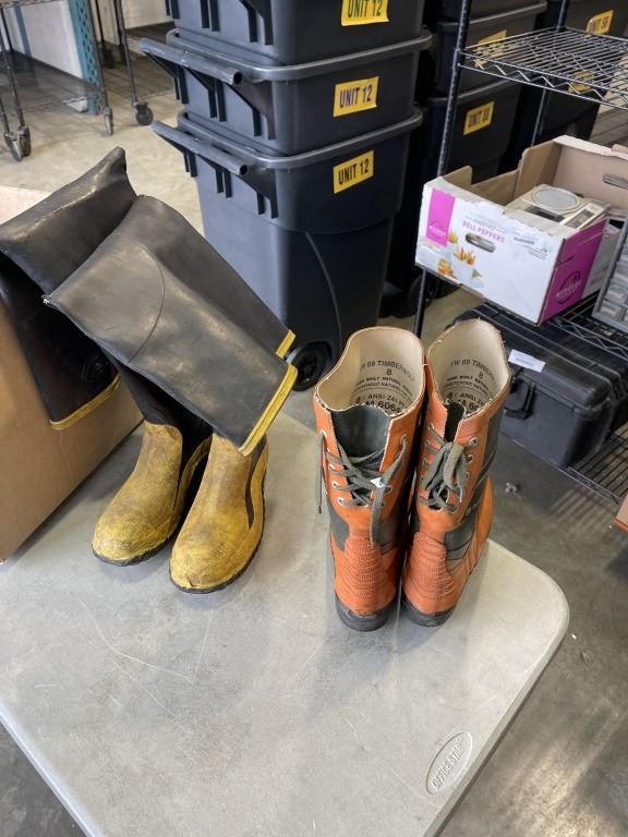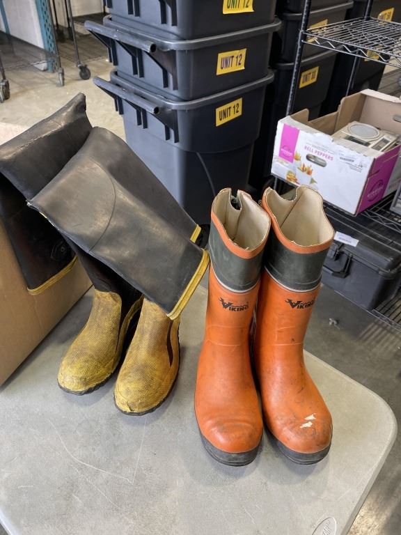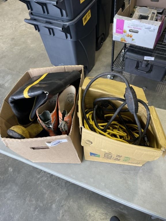 2 PAIRS OF SIZE 8 GUM BOOTS, AND 2 OUTDOOR EXTENSION CORDS
