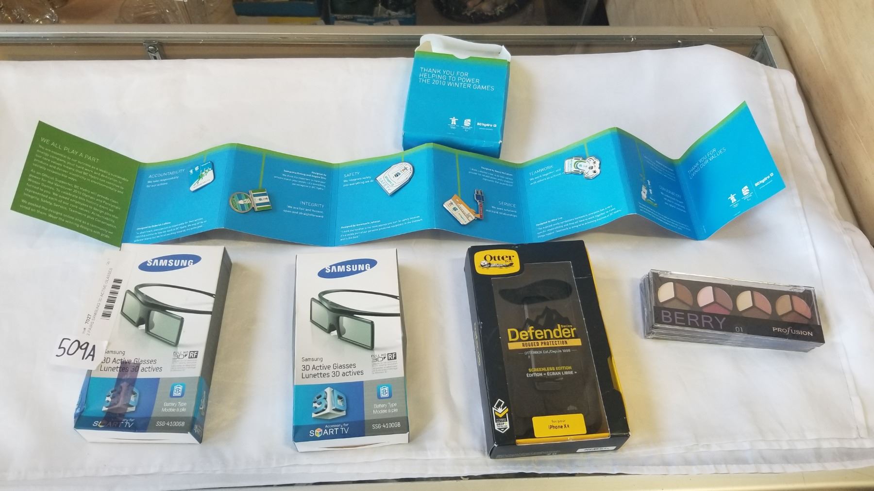 2 PAIRS SAMSUNG 3D ACTIVE GLASSES SSG-4100GB, OLYMPIC 2010 PIN SET, OTTER BOX FOR IPHONE X R AND NEW BERRY PRO FUSION MAKEUP
