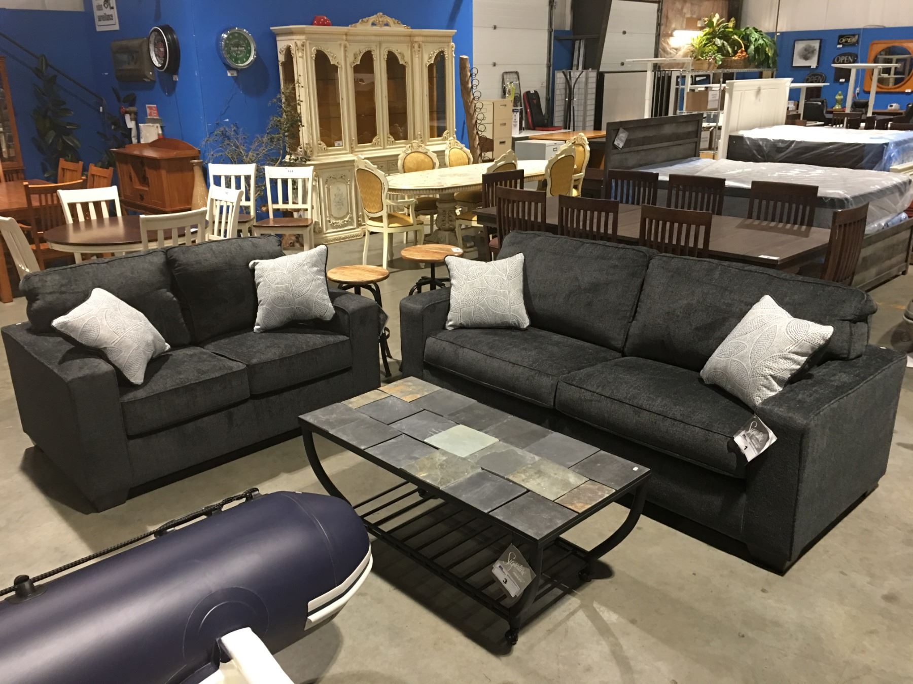 2 PCE CHARCOAL GREY UPHOLSTERED SOFA & LOVESEAT SET WITH 4 CUSHIONS