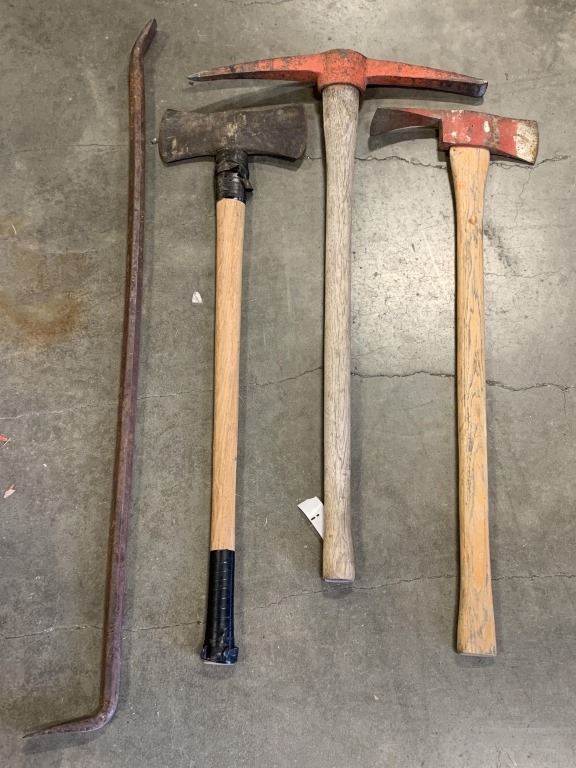 2 PICK AXES, DOUBLE ENDED AXE AND WRECKING BAR