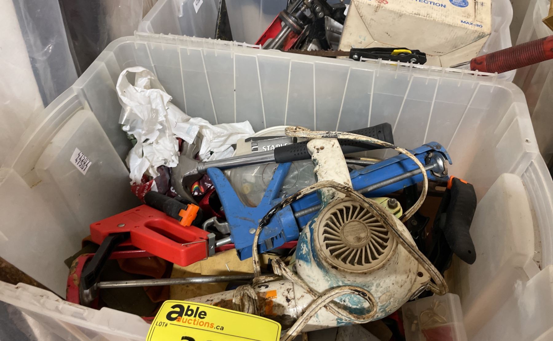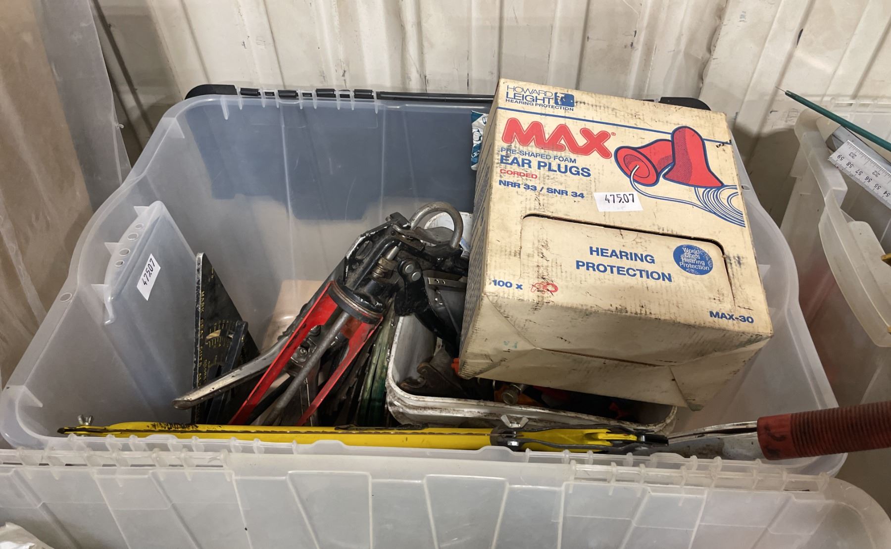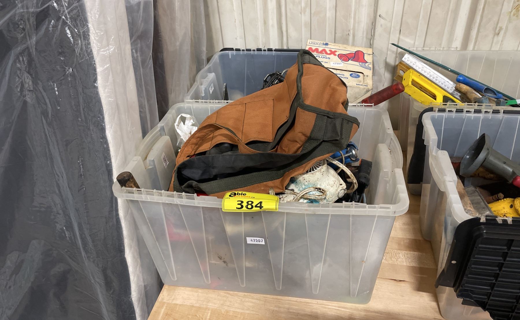 2 PLASTIC FOLD TOP BINS OF ASSORTED HAND TOOLS, POWER TOOLS & ASSORTED SHOP CONTENTS *PLASTIC BINS