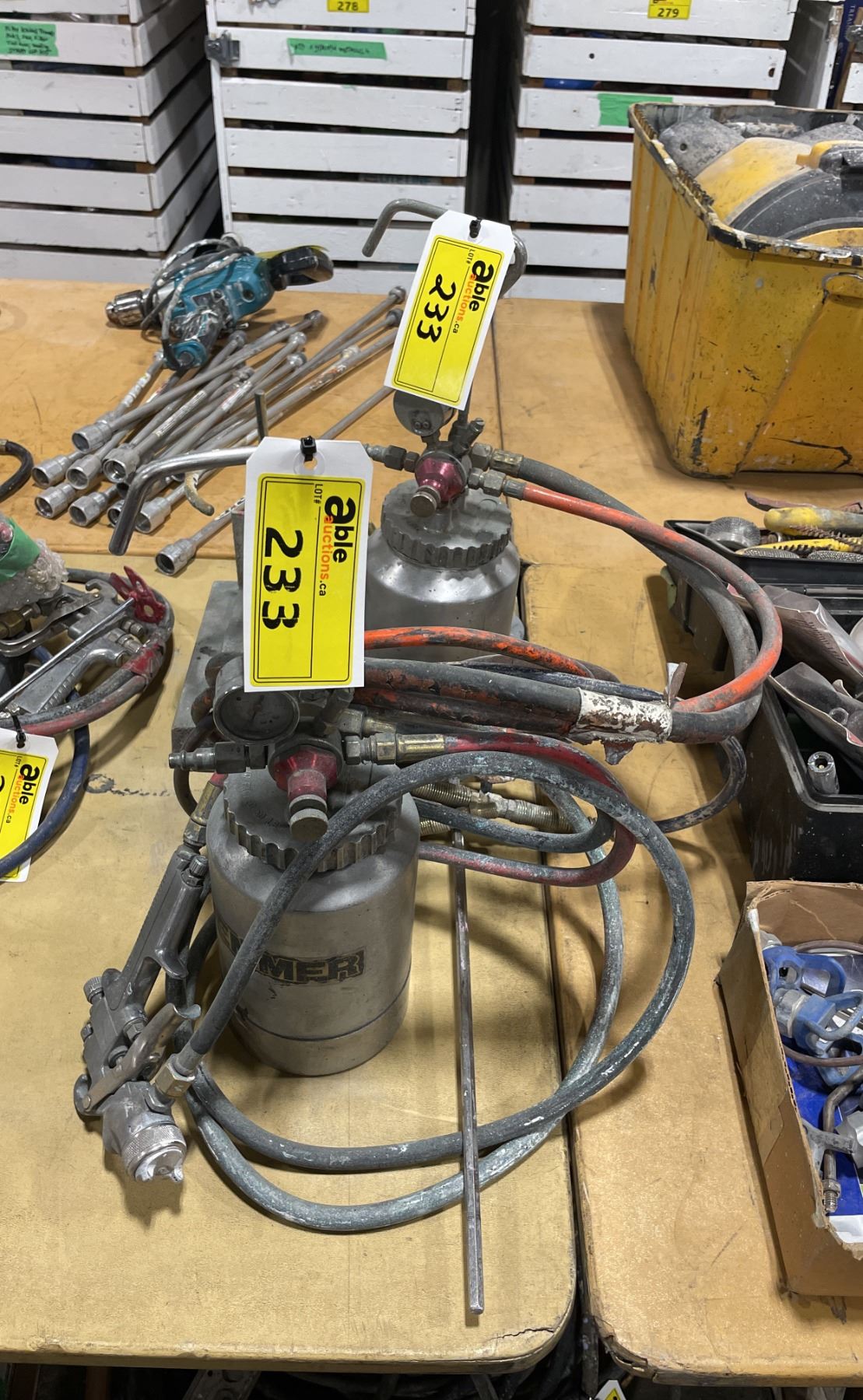 2 PNEUMATIC HAND HELD PAINT SPRAYER GUNS WITH PAINT POTS & STAND