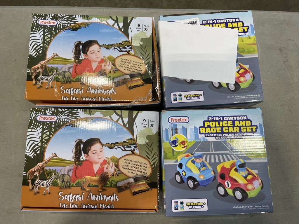 2 PREXTEX 2 IN 1 CARTOON POLICE AND RACE CAR SETS AND 2 SAFARI ANIMALS