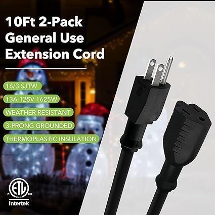 - BN-LINK 10 Ft Outdoor Extension Cord 16/3 SJTW General Purpose Power Cord, 3 Prong Grounded Plug, 13-Amp, Black, for Lawn, Garden, Appliances, ETL Listed, 2 Pack