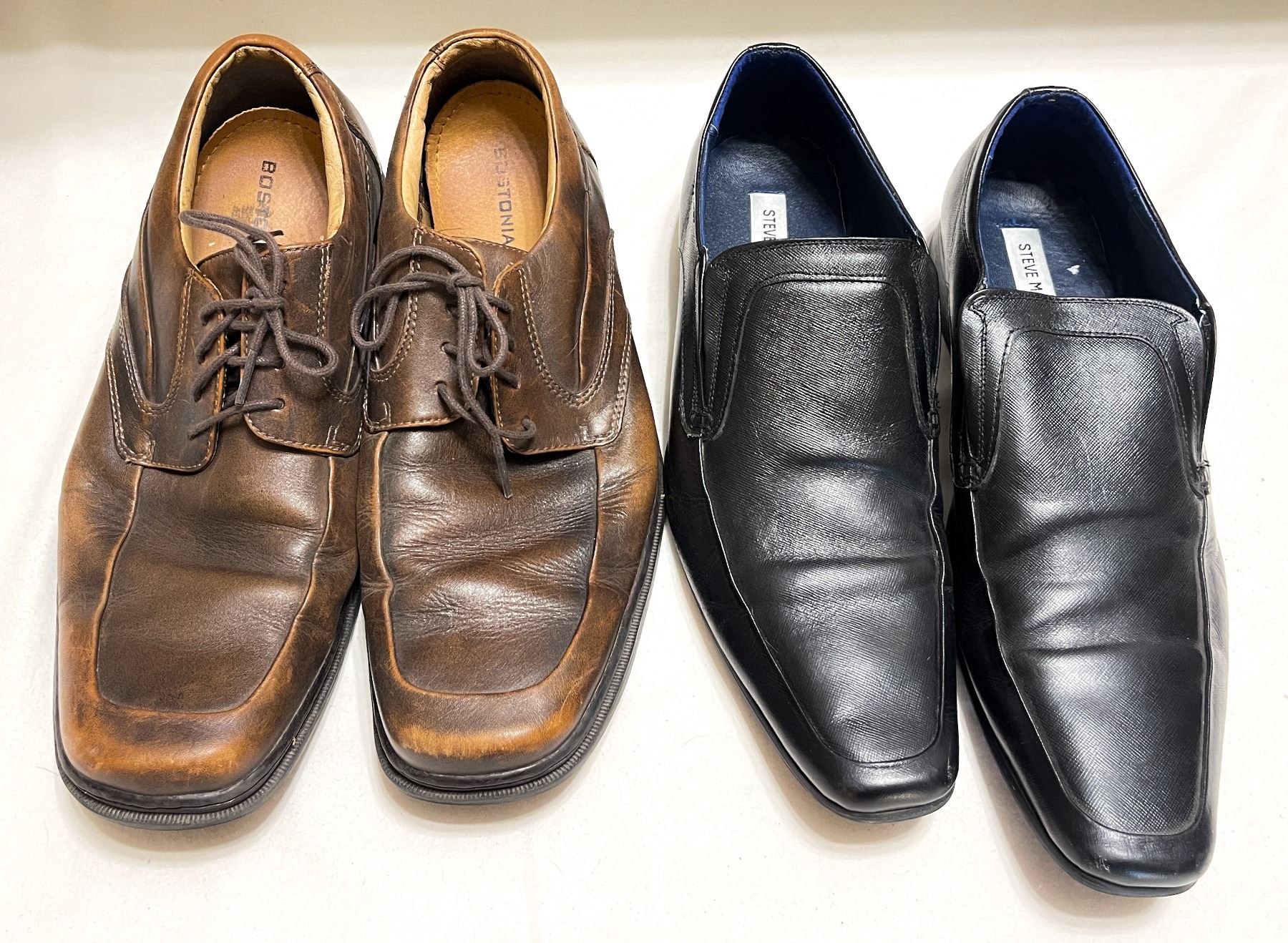 Lot includes a vintage pair of brown Bostonian lace-up oxfords and a black pair of Steve Madden slip-on dress shoes, both in men’s size 12. Crafted from genuine leather with sturdy soles and classic square toes, both pairs show light, even wear and remain in good vintage condition.