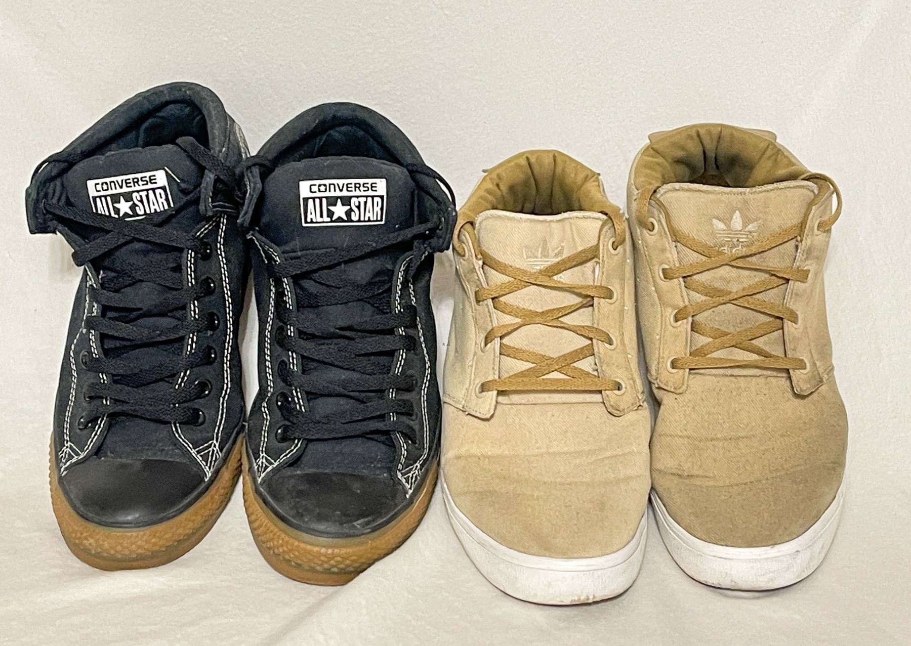 Adidas men’s sneakers, size 12, fair/good used condition (need washing). Converse All Star high tops, size 11, very good/excellent condition.