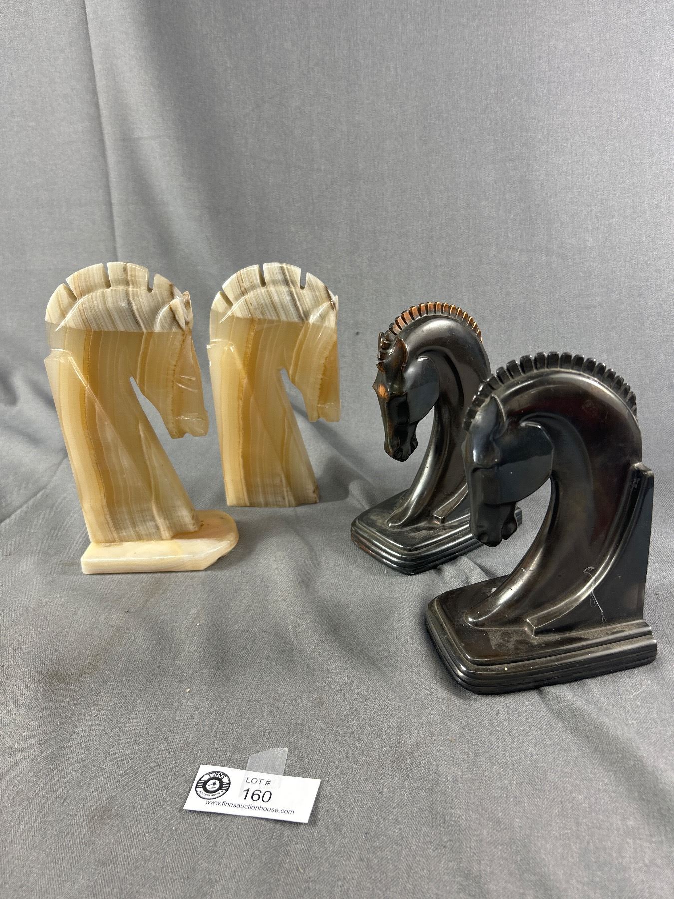 2 Pairs Of Vintage Horse Head Book Ends. Stone Is Approx. 9" H ,Brass Metal Is Approx. 7"