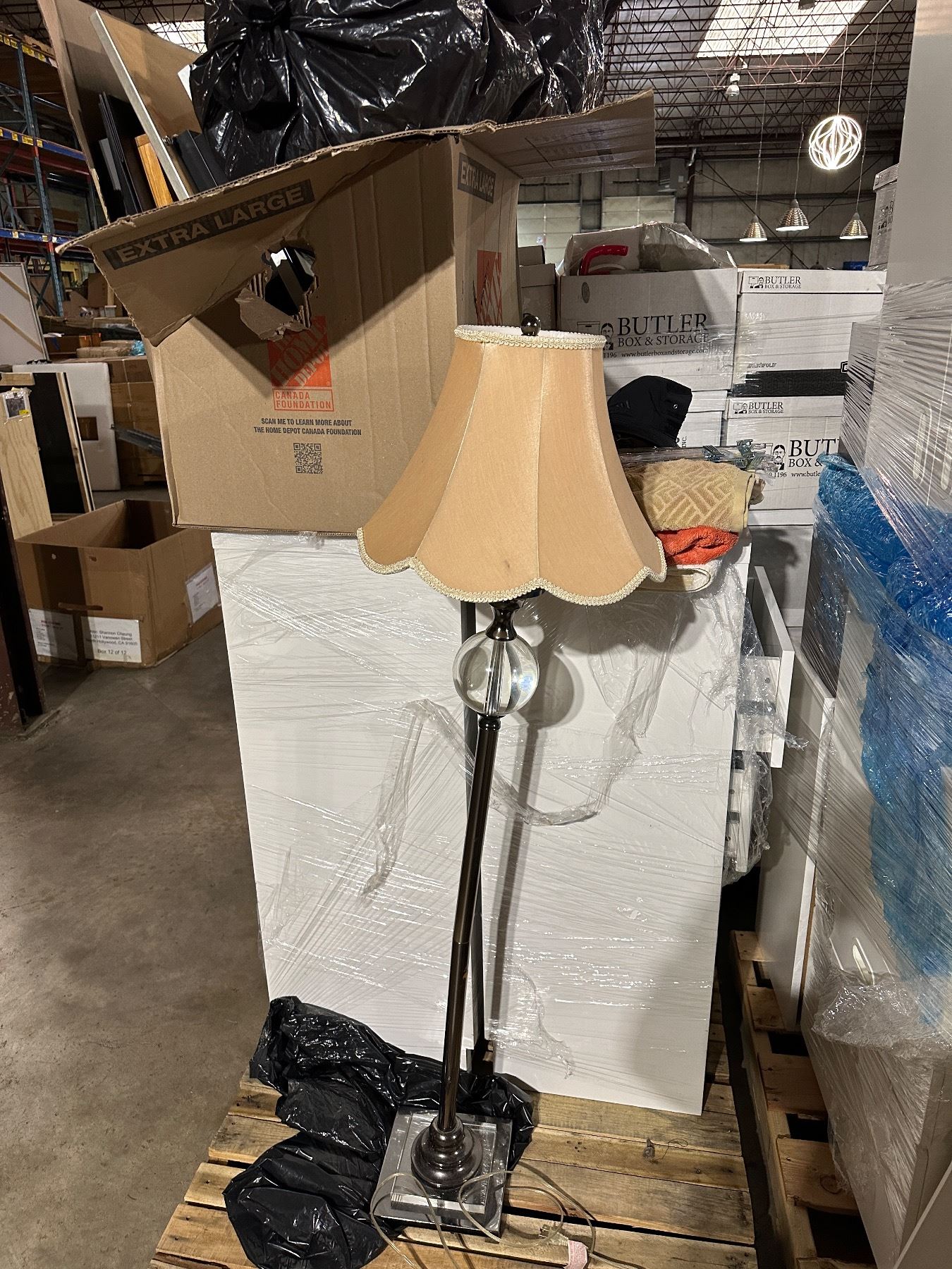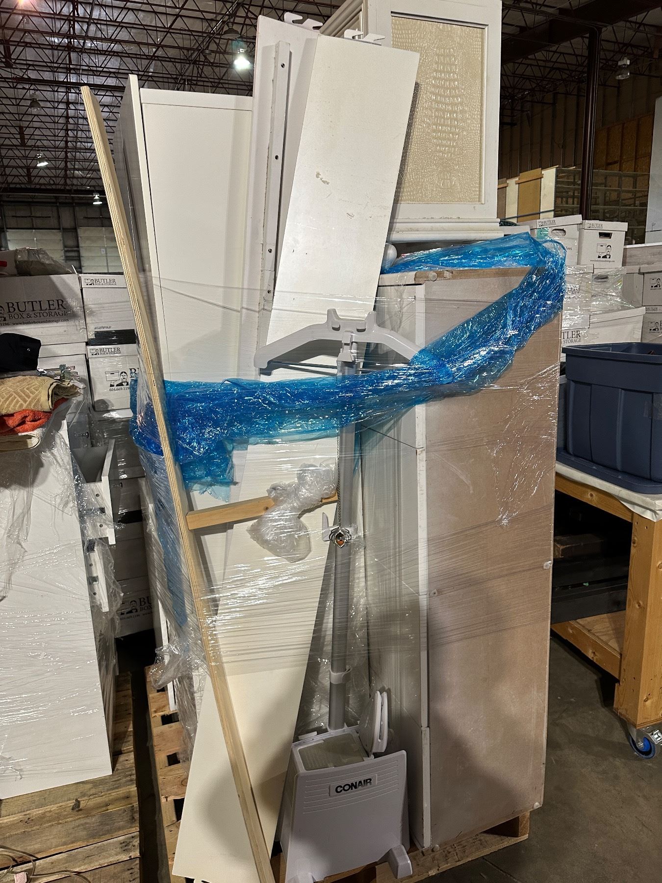 3 Pallets lot of misc. items including - 2 5 drawers white chest, lamp w/shade, white cabinets, Conair steamer, misc. frame pictures, etc...