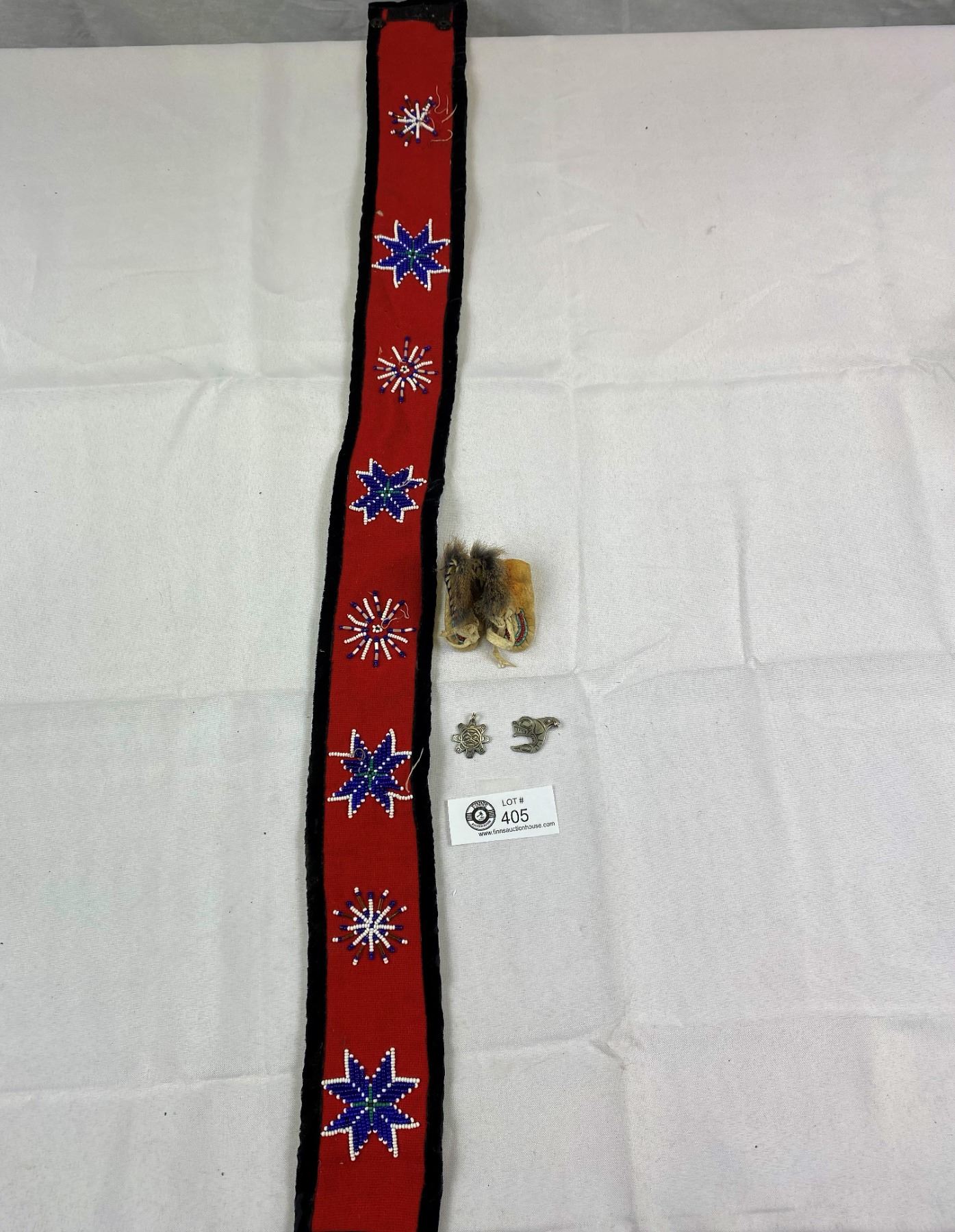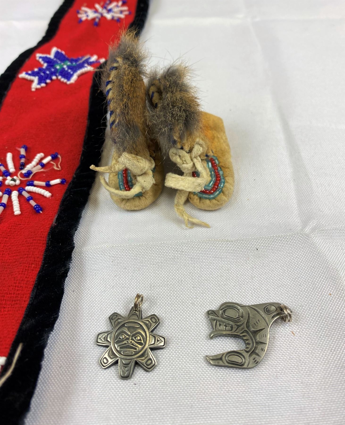 2 Pewter Indigenous Pendants, Beaded Sash, As Is, And Miniature Moccasins