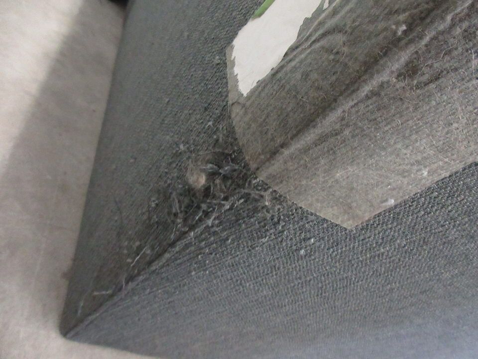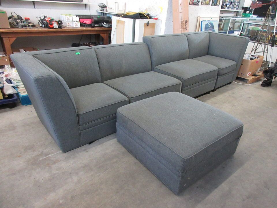 Grey fabric upholstery. Customer return. Some cat scratches. Two 6' sectional pieces. 3' x 3' ottoman.