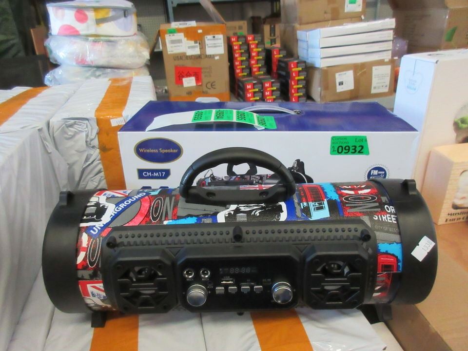 Radio/MP3/TF/USB/FM Radio/BT. 16" long x 6" diameter. Has carry strap.