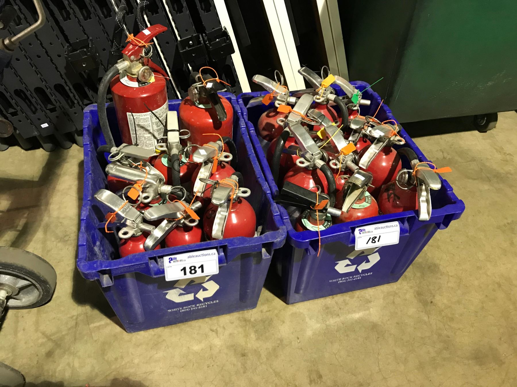 2 RECYCLING BINS OF ASSORTED FIRE EXTINGUISHERS