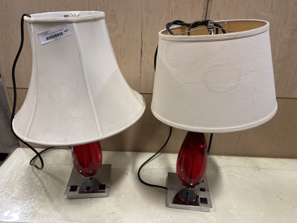 2 RED GLASS TABLE LAMPS WITH POWER OUTLETS