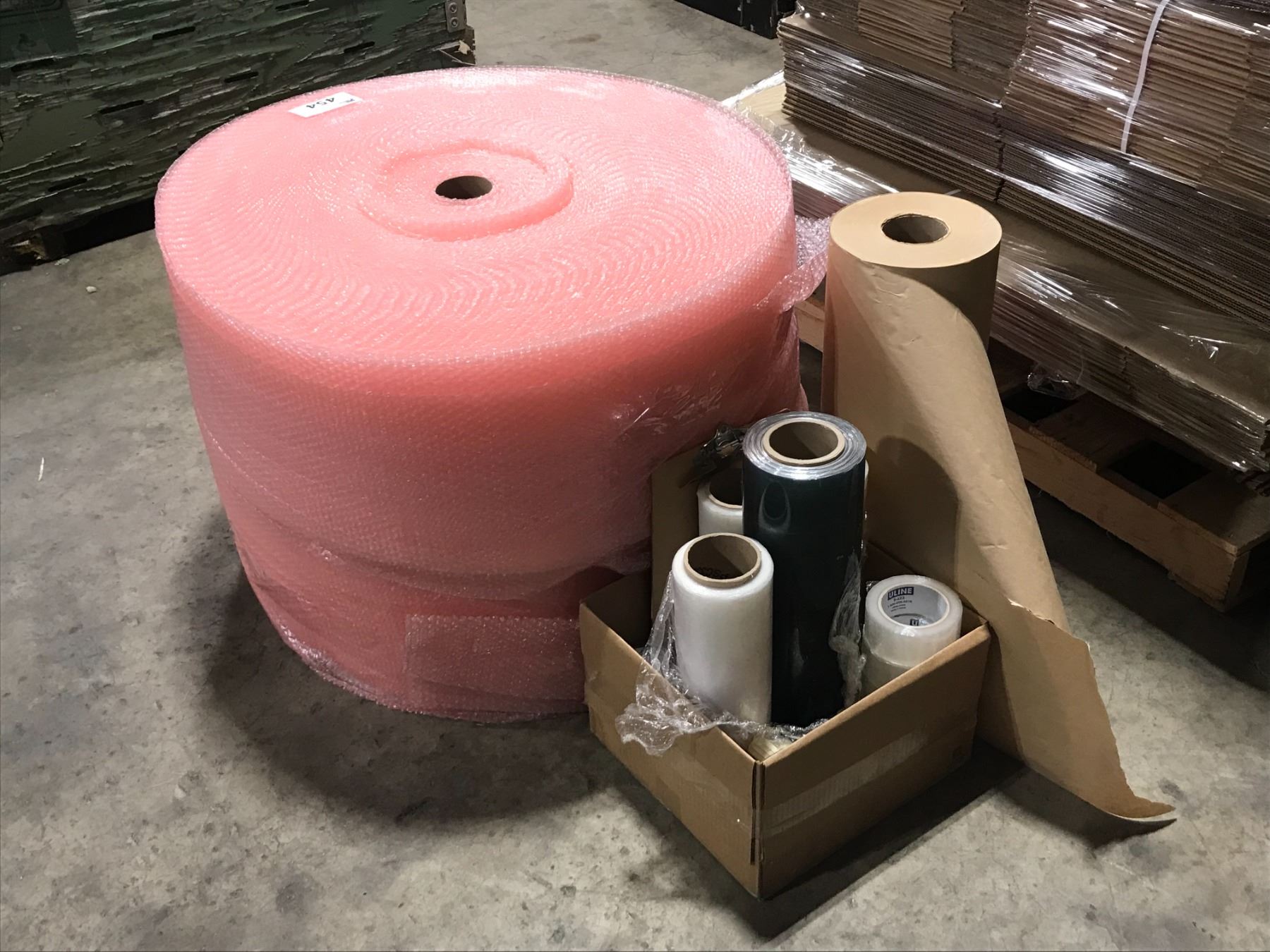 2 ROLLS OF PACKING BUBBLE WRAP, ROLL OF PACKING PAPER AND BOX OF ASSORTED SHRINK WRAP AND TAPE