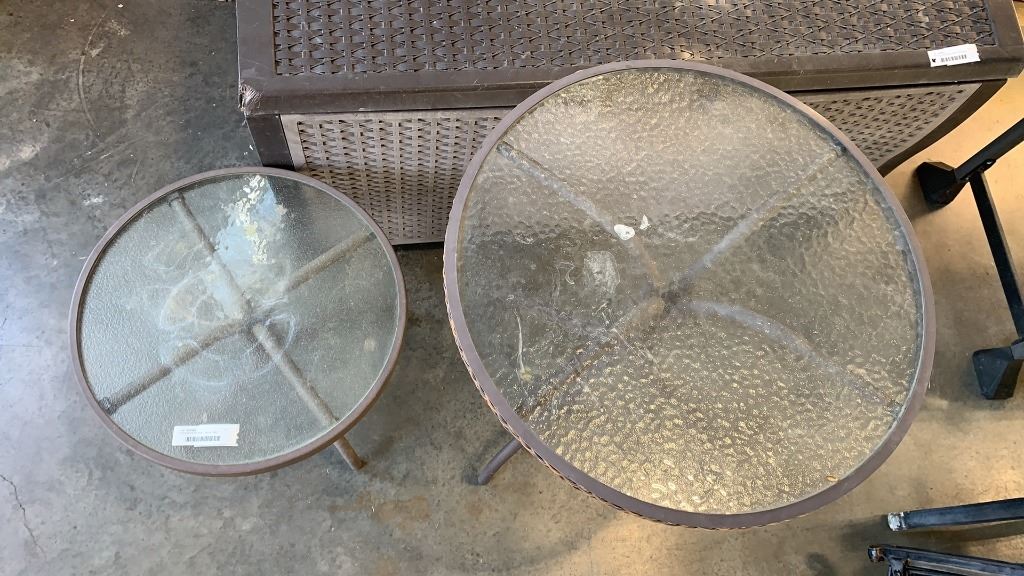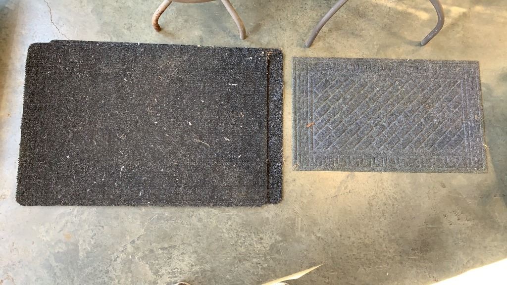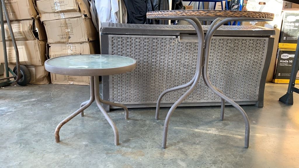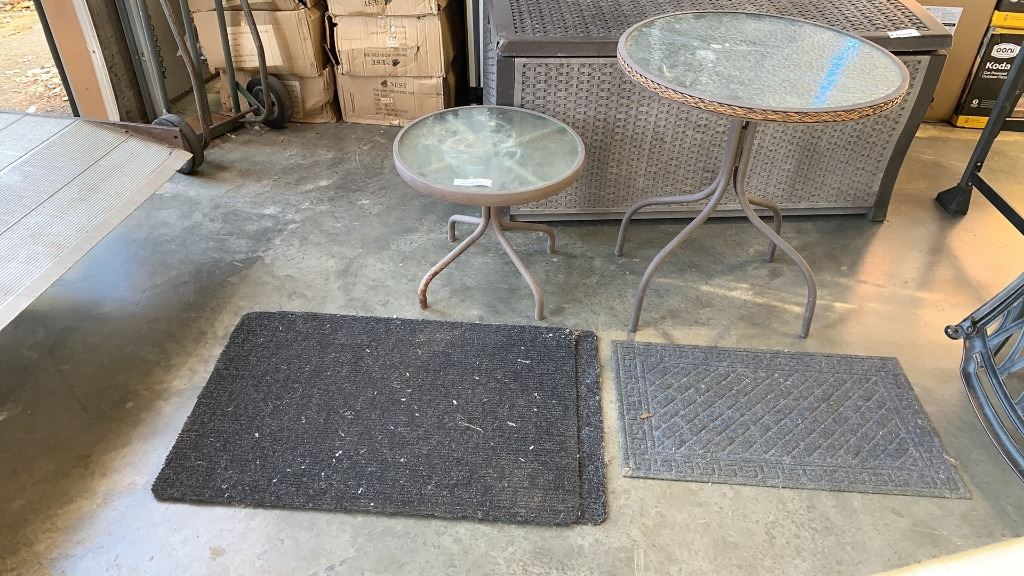 2 ROUND PATIO SIDE TABLES AND OUTDOOR MATS
