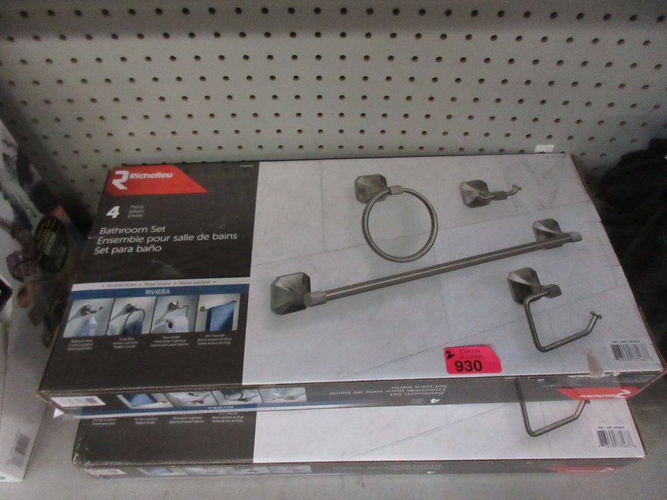 Brushed nickel. Each set contains a robe hook, toilet tissue holder, towel ring and towel bar. Open box.