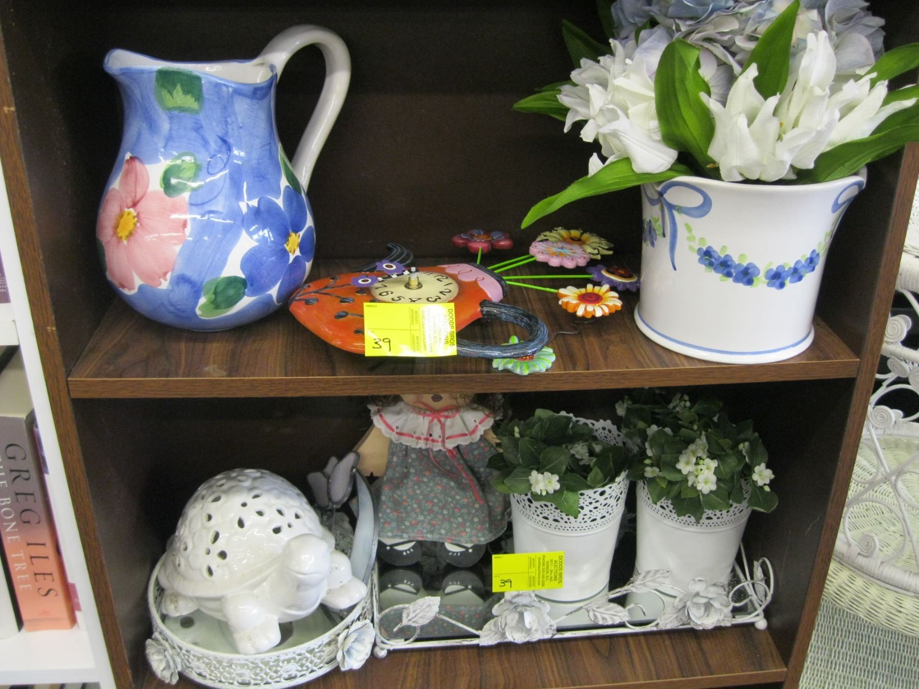 2 SHELVES OF MISC PLANTERS, CLOCKS, CERAMIC TURTLE ETC.