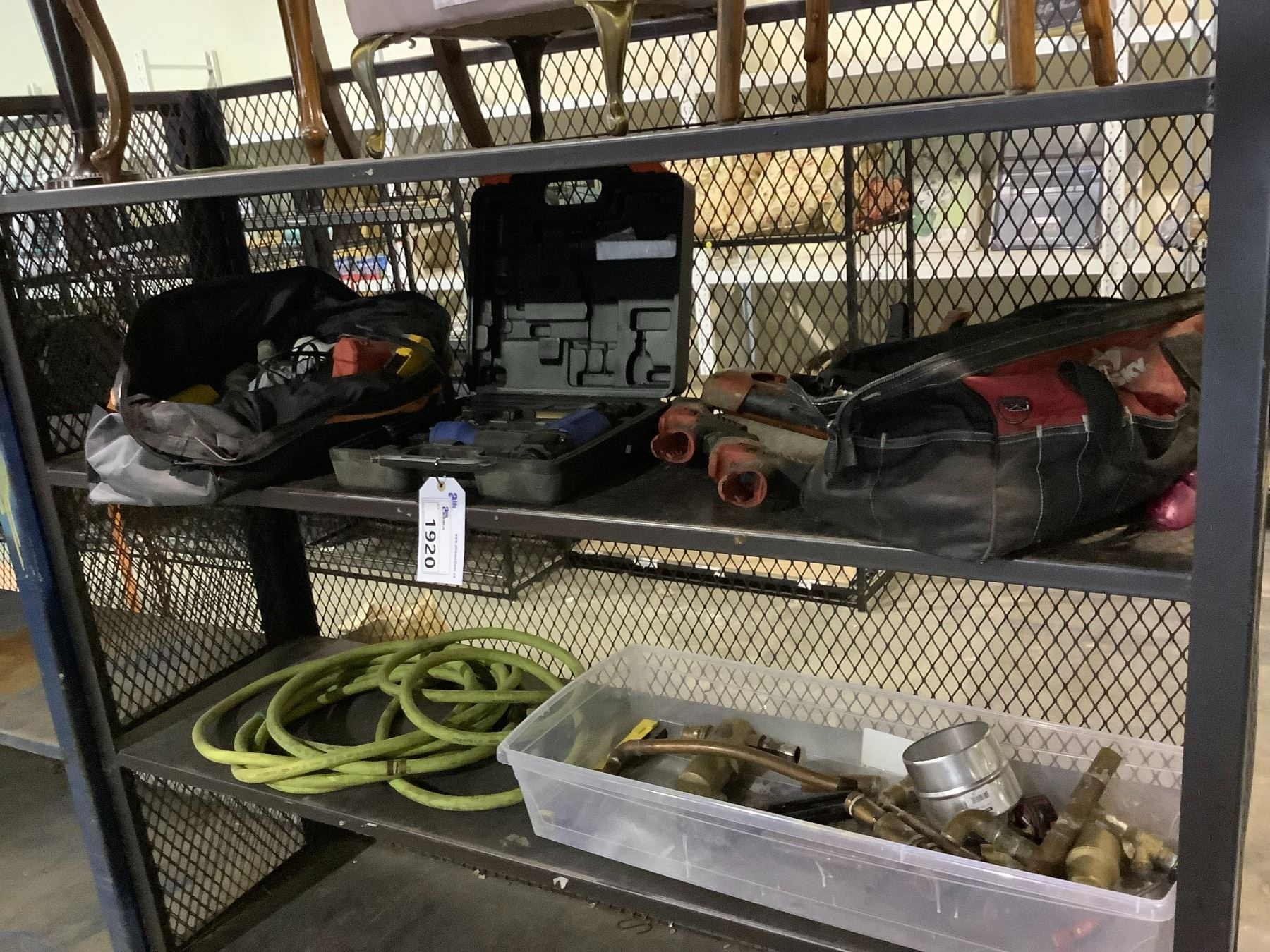 2 SHELVES OF TOOLS, MILWAUKEE, RIDGID TOOL BAG, AND CONTENTS,