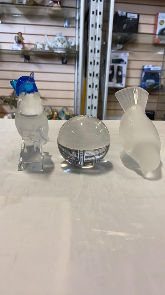 2 SIGNED HEAVY GLASS BIRD FIGURES, AND GLASS PAPERWEIGHT