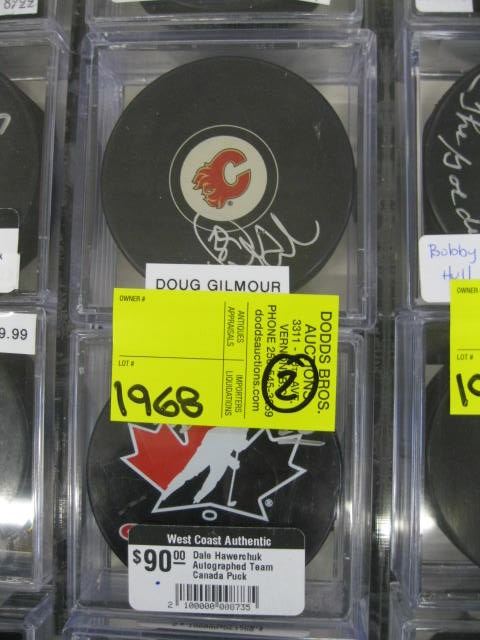 2 - SIGNED PUCKS - DOUG GILMOUR CALGARY FLAMES & DALE HAWERCHUK TEAM CANADA