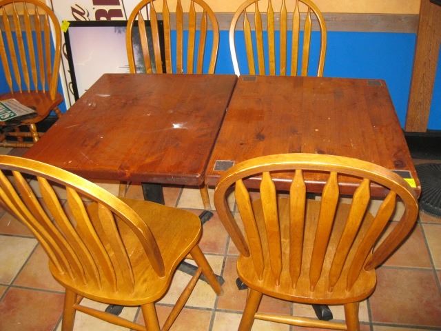 2 SINGLE PEDESTAL TABLES, 4 ARROWBACK CHAIRS