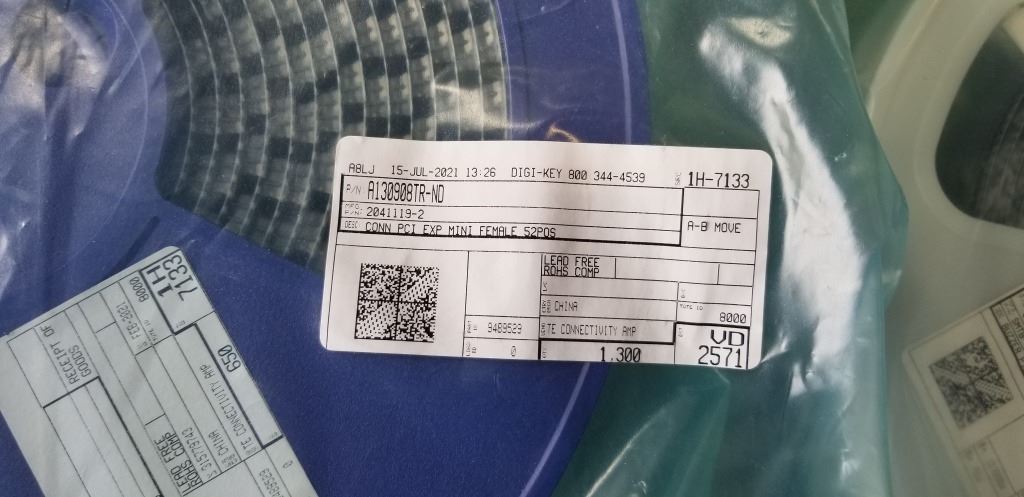 2 SPOOLS OF BUZZERS TRANSDUCER, EXTERNALLY DRIVEN PIEZO 3 V 3MA 4KHZ 75DB @ 3V, 10CM SURFACE MOUNT SOLDER PADS AND 52 POSITION FEMALE CONNECTOR PCI EXPRESS MINI CARD GOLD 0.031" (0.80MM) BLACK