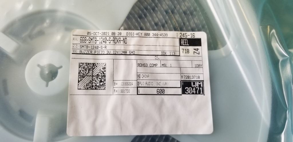 2 SPOOLS OF BUZZERS TRANSDUCER, EXTERNALLY DRIVEN PIEZO 3 V 3MA 4KHZ 75DB @ 3V, 10CM SURFACE MOUNT S