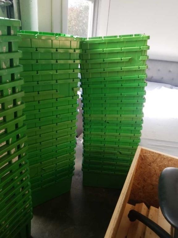 2 STACKS OF GREEN BINS - VARIOUS QUALITY, SOME BROKEN