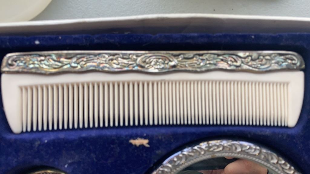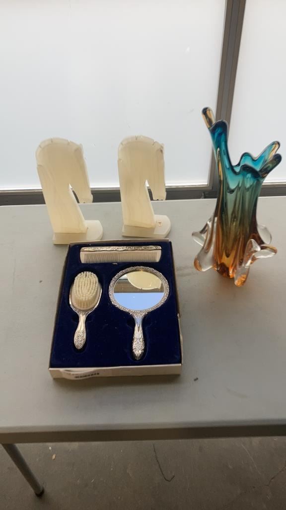 2 STONE HORSE HEAD FIGURES, ART GLASS VASE AND VANITY SET