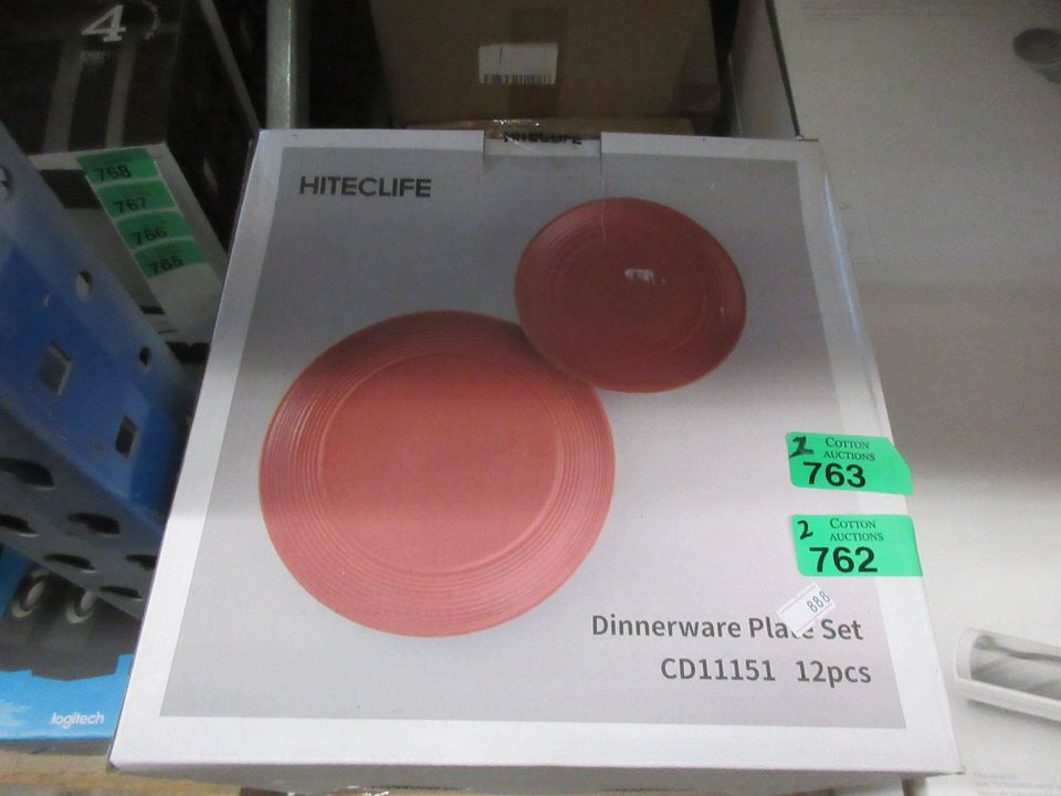 Russet Red. Six 8" salad plates and six 10.8" dinner plates. Dishwasher and microwave safe.