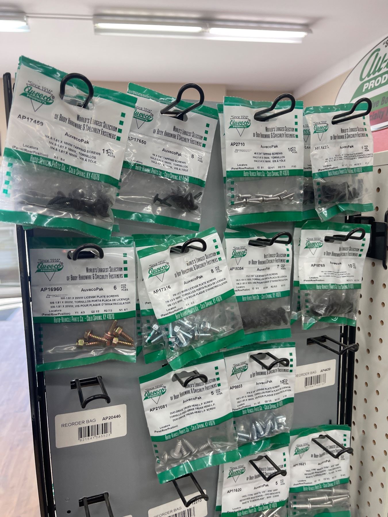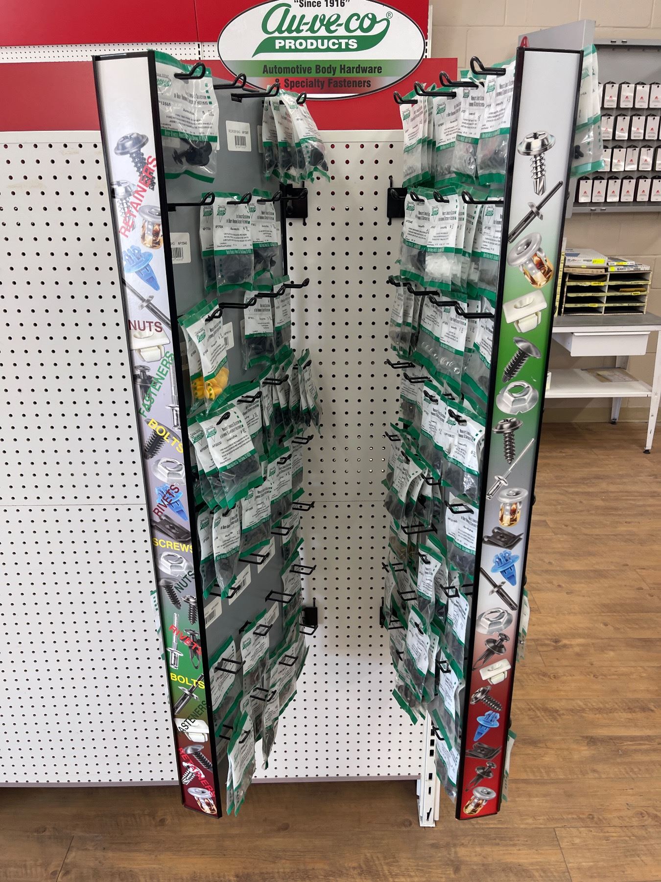 2 Shelves of Various Tools/Nuts & Bolts - Duo Drive Truss Head, License Plate Screws, Ford Trim Panel Retainers, Ford Radiator Shroud Retainer, Aluminum Rivets, Etc. (Shelf Included)