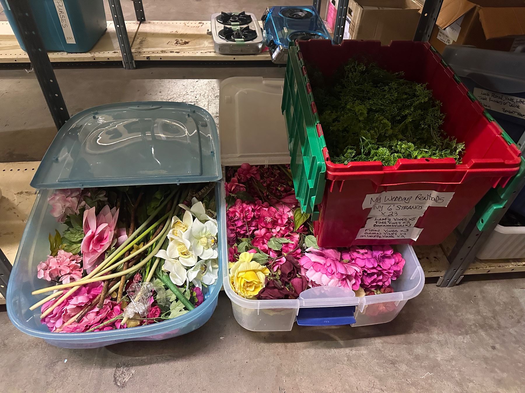 3 Shelves of artificial flowers, shrubs, ivy, etc...