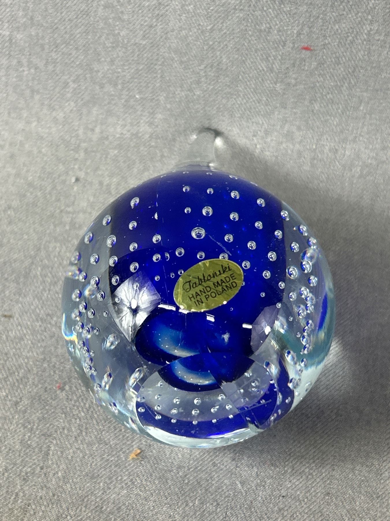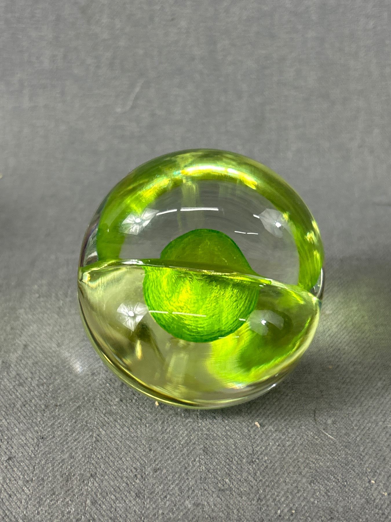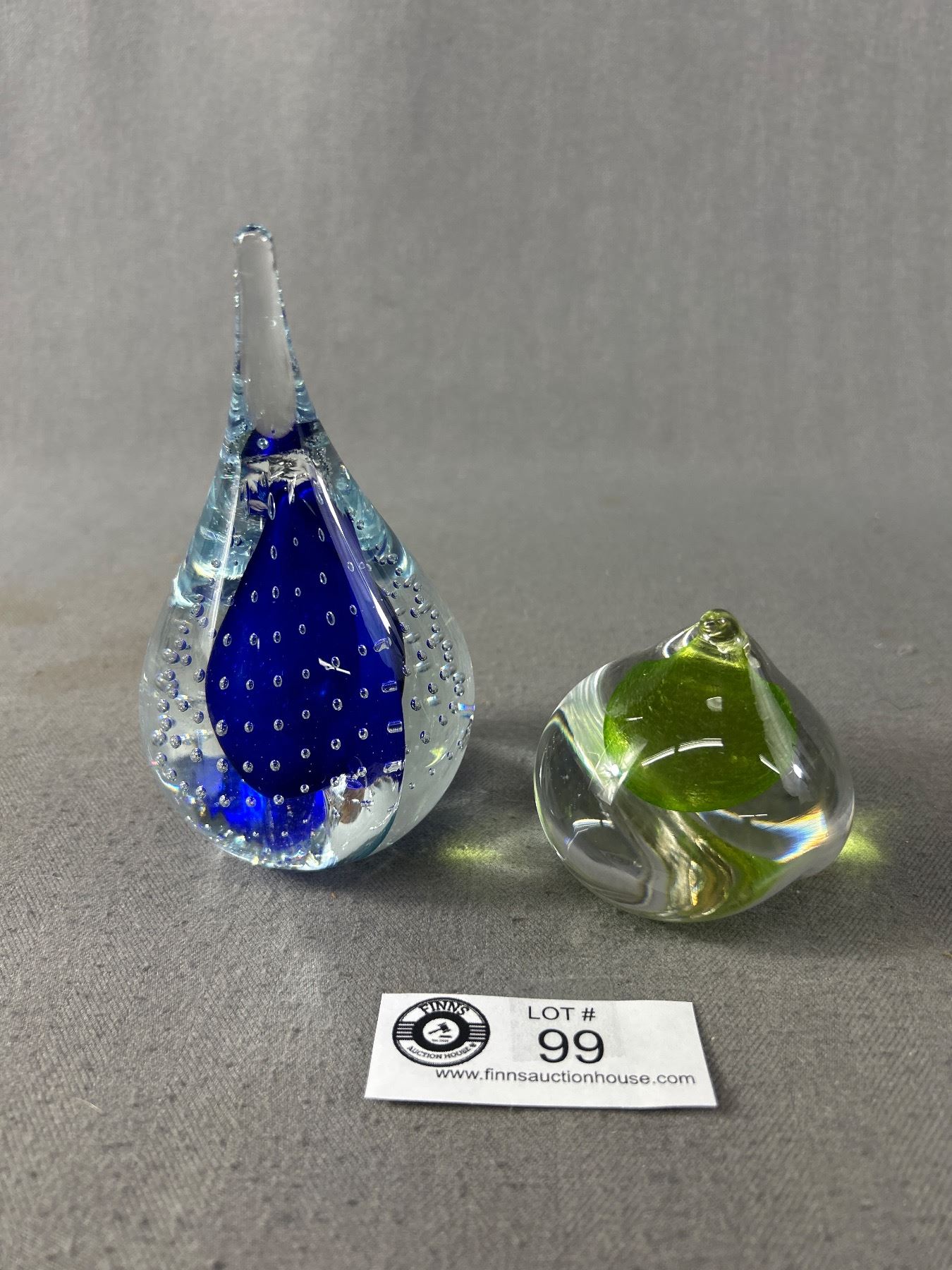2 Signed Paperweights - Adam Jablonski Art Glass Controlled Bubble Blue Paperweight 5.5" & Signed Greem Paperweight