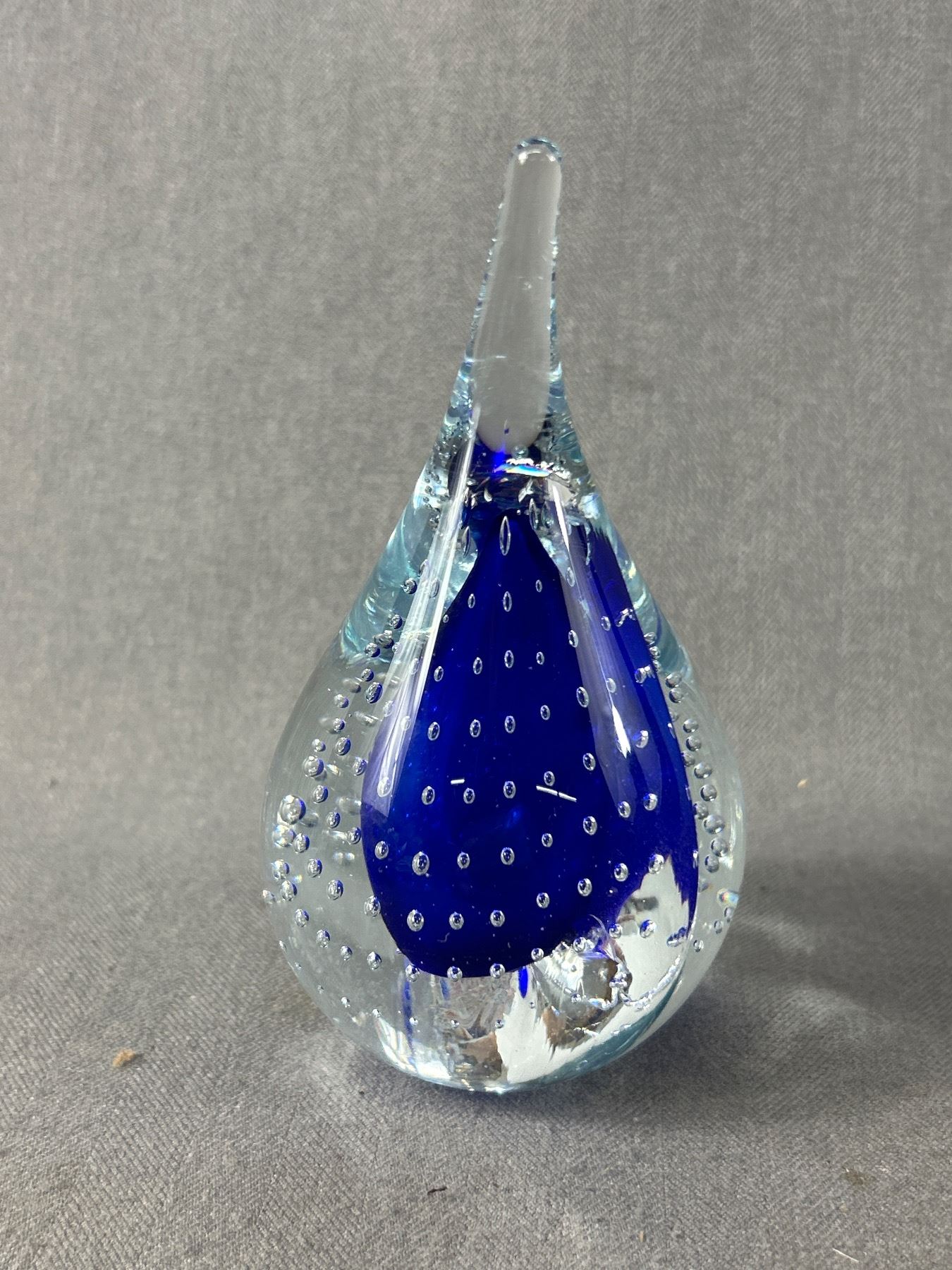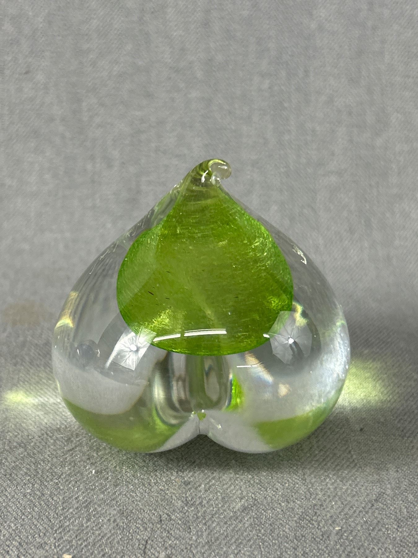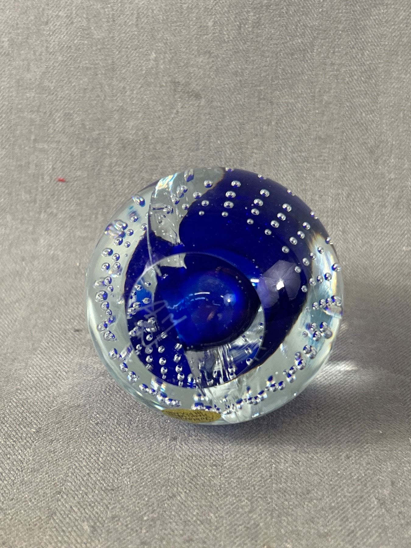 2 Signed Paperweights - Adam Jablonski Art Glass Controlled Bubble Blue Paperweight 5.5" & Signed Greem Paperweight