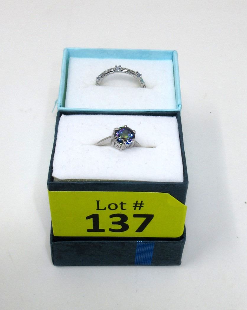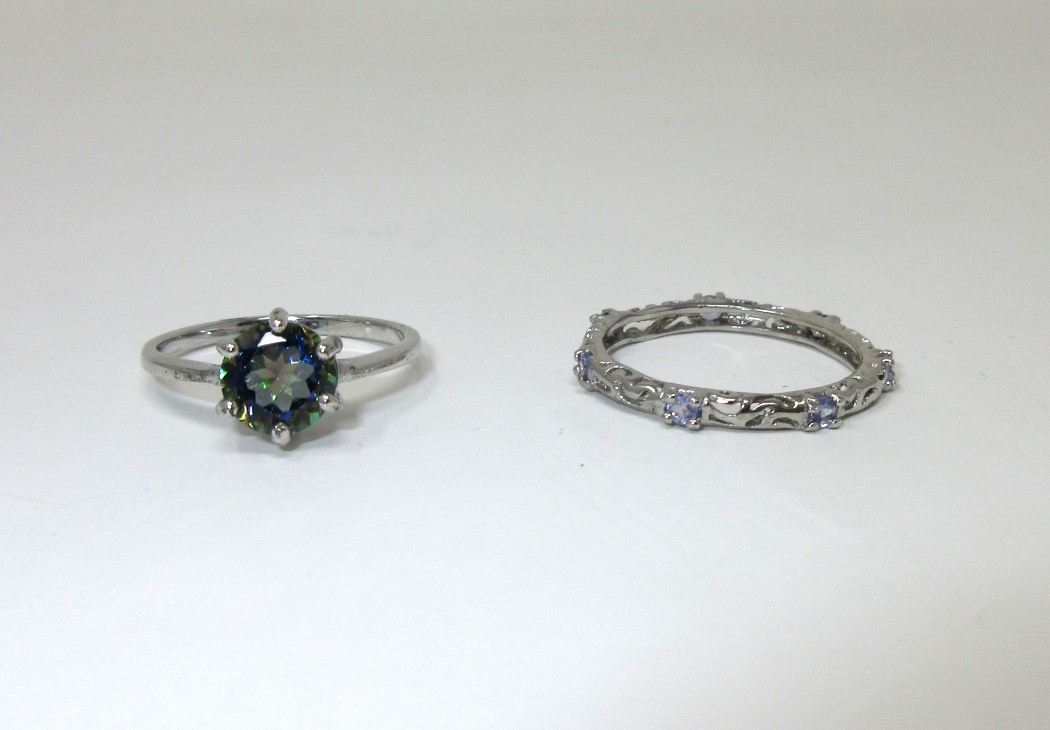 Ocean blue mystic topaz ring & band ring with 7 round tanzanite gemstones.