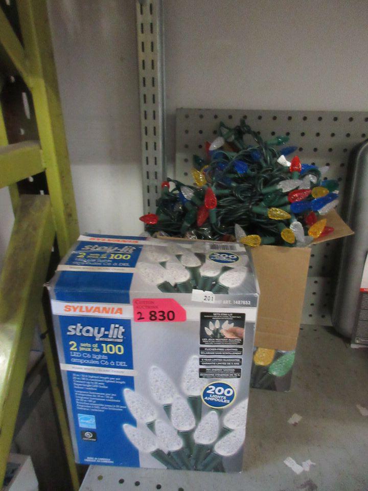 Set of 2 strings of 100 clear C6 bulbs and set of 2 strings of 100 coloured C6 bulbs. Open box.