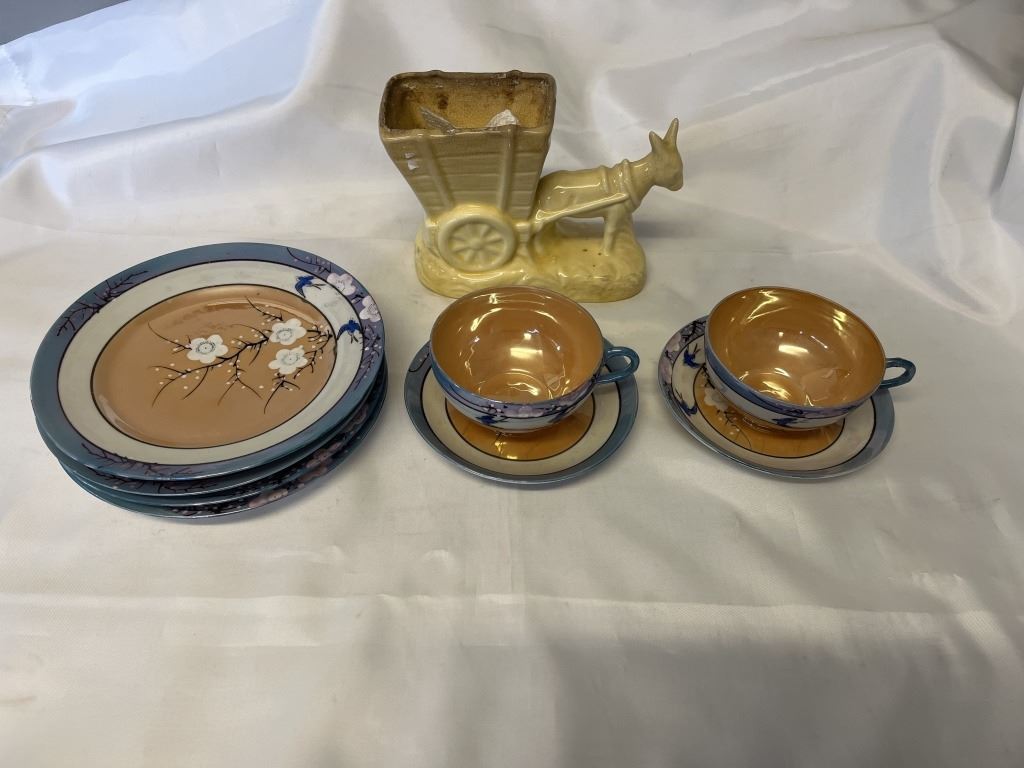 2 TEACUPS WITH SAUCERS, 4 DINNER PLATES, AND HORSE VASE