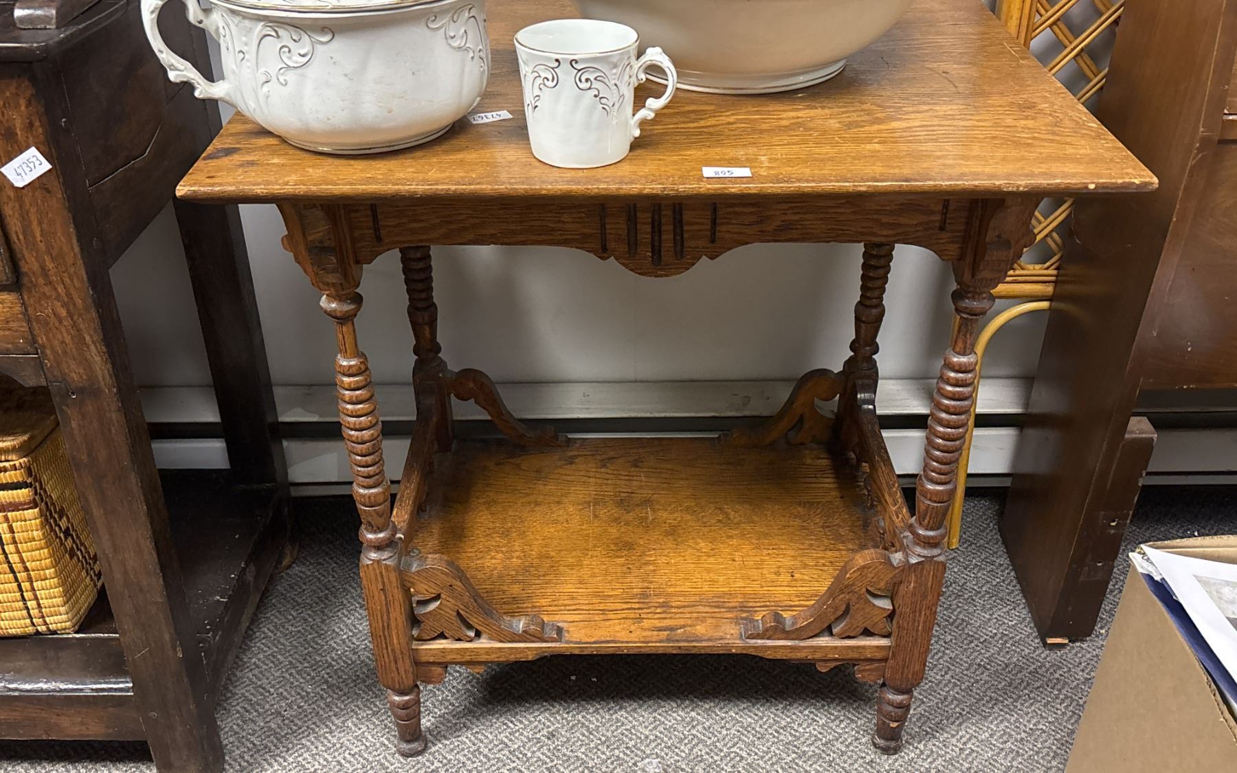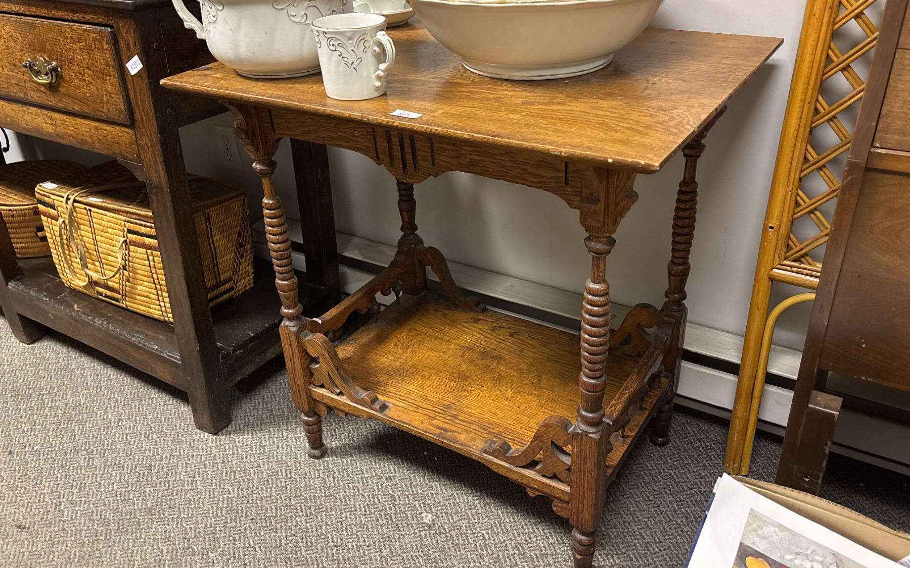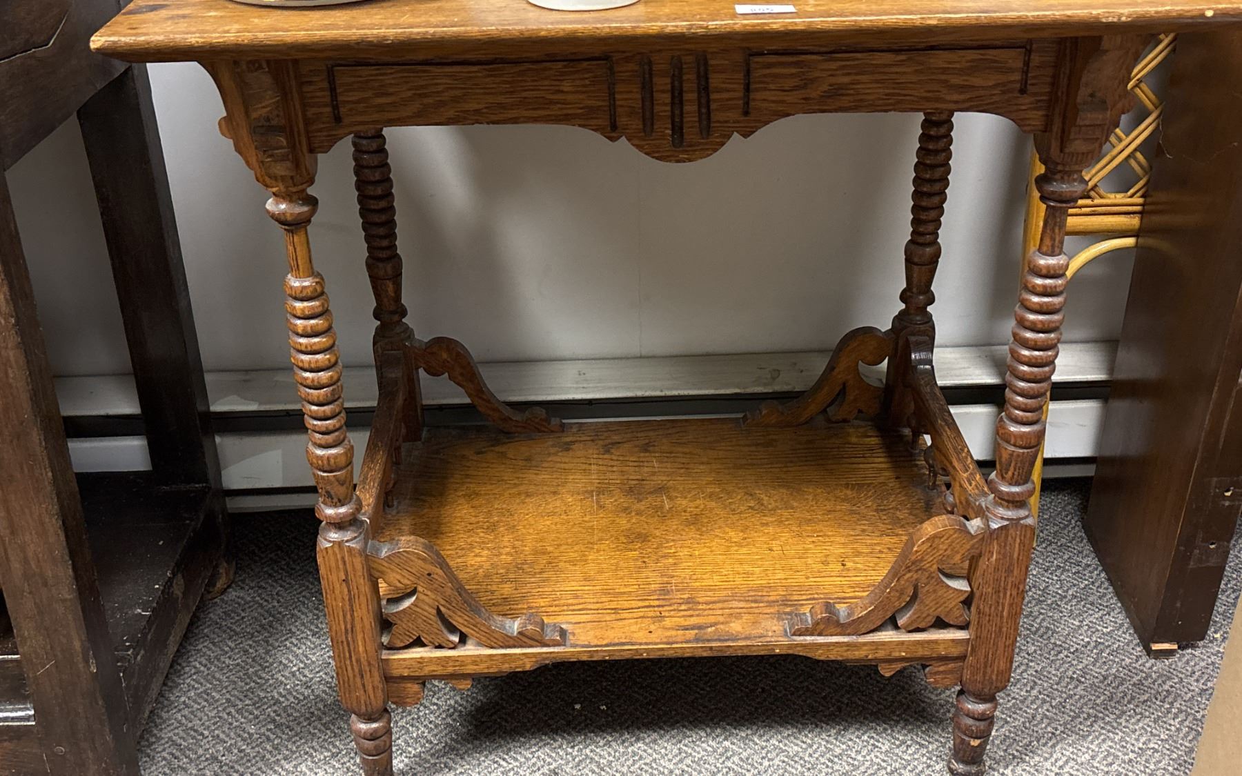 2-TIER ANTIQUE END TABLE 28.5" X 20.5" X 29" (CONTENTS NOT INCLUDED)