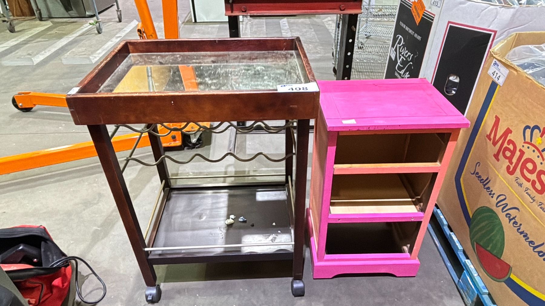 2 TIER MOBILE WOODEN BAR CART & A PINK TABLE