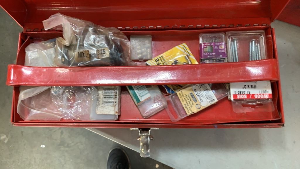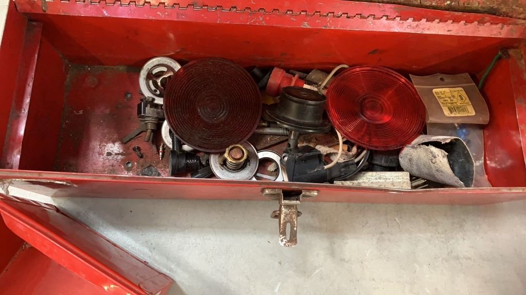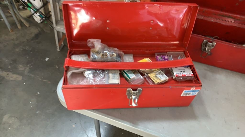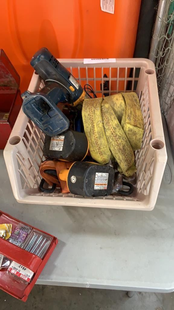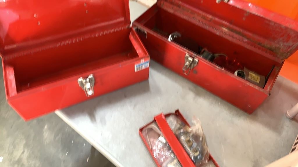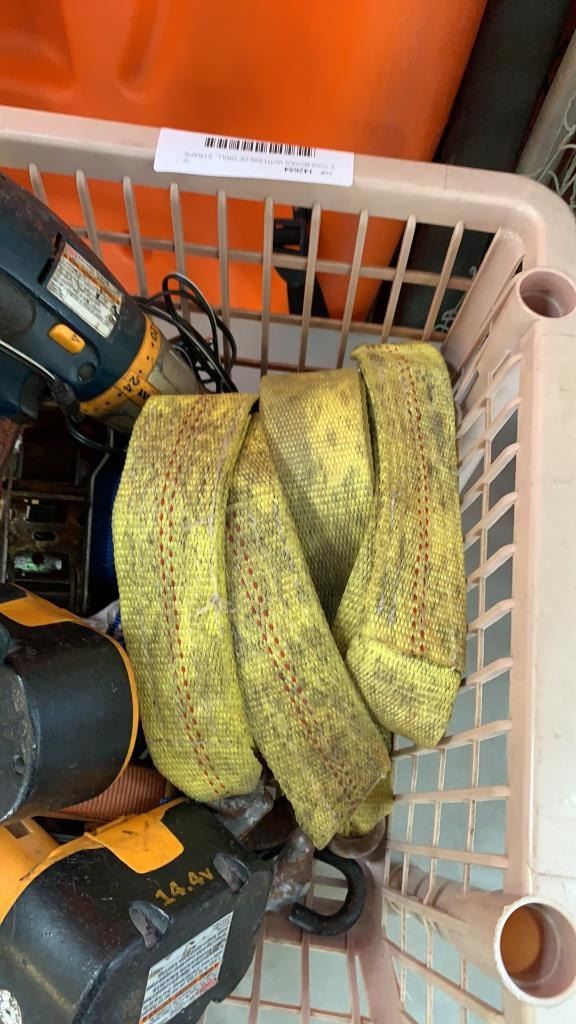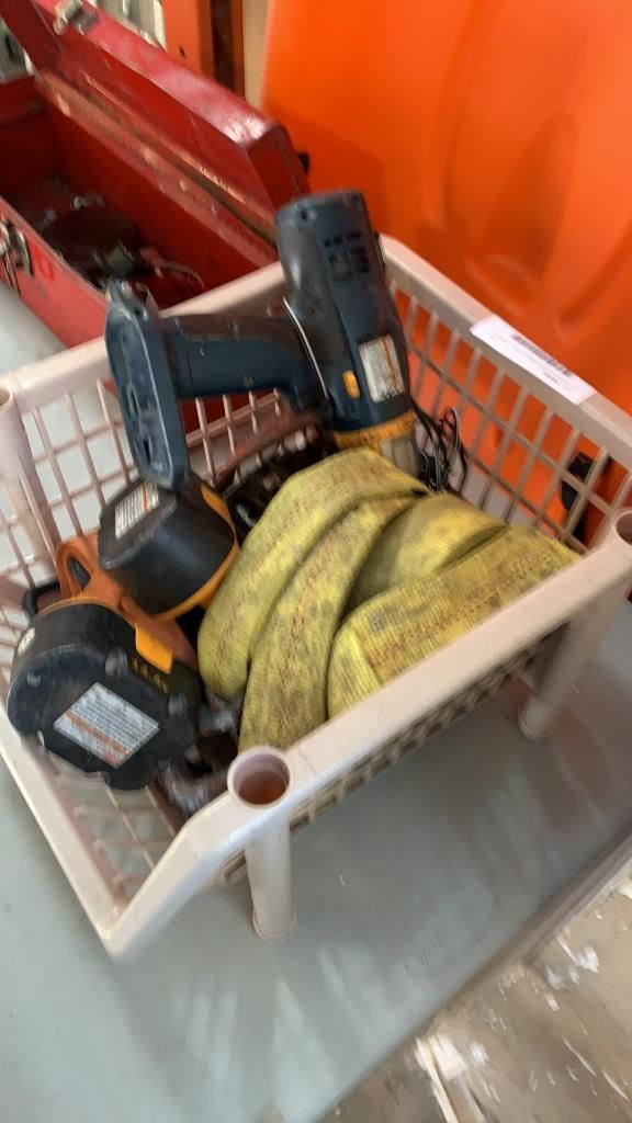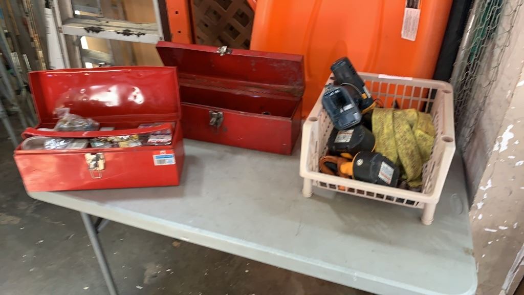2 TOOLBOXES WITH BIN OF DRILL, STRAPS AND MORE