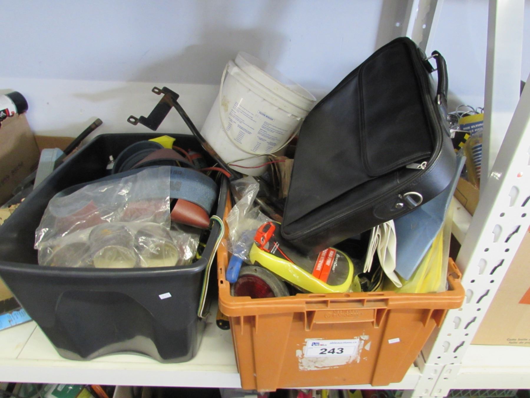 2 TOTES OF ASSORTED TRUCK LIGHTS, AUTOMOTIVE PARTS, SANDING PAPER, LOAD STRAPS, ETC
