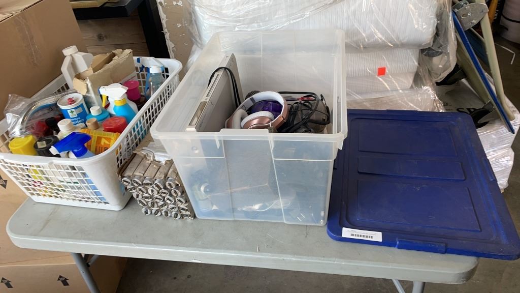 2 TOTES OF ELECTRONICS AND CLEANING SUPPLIES