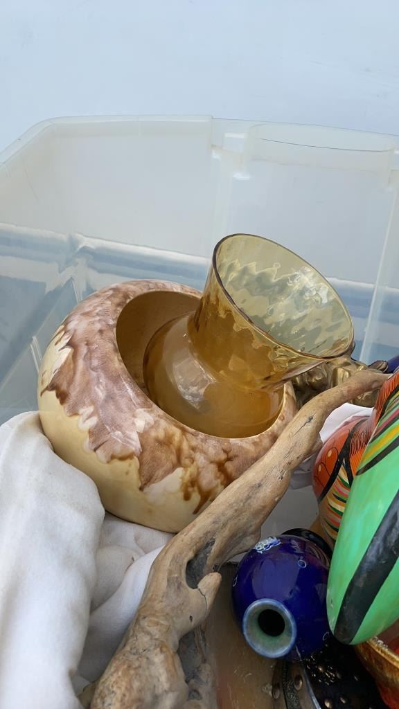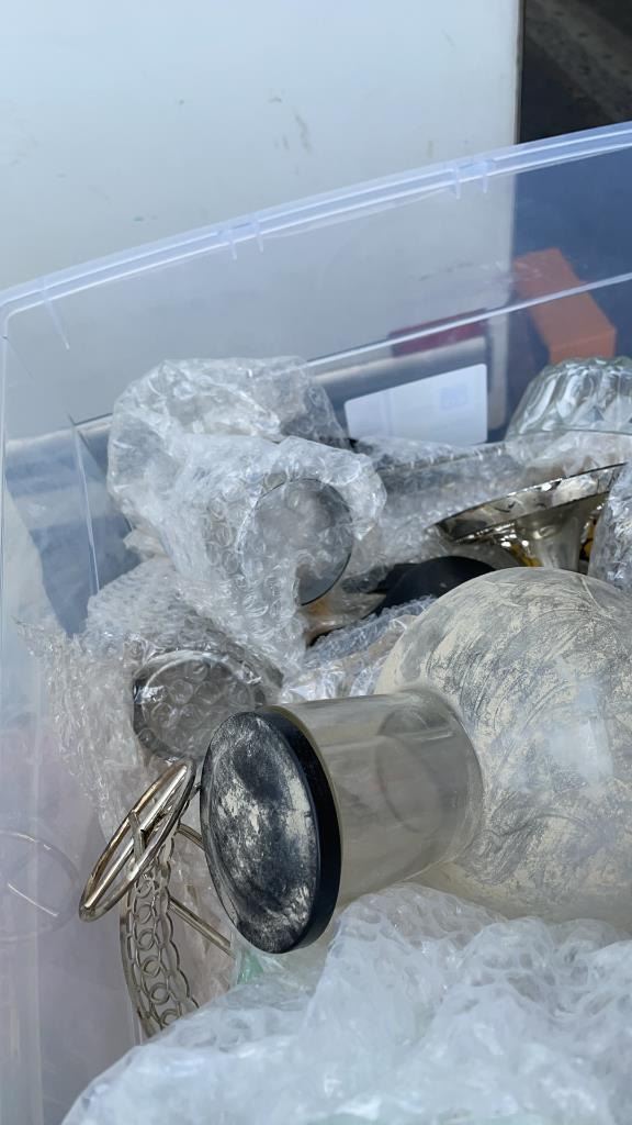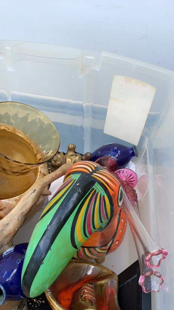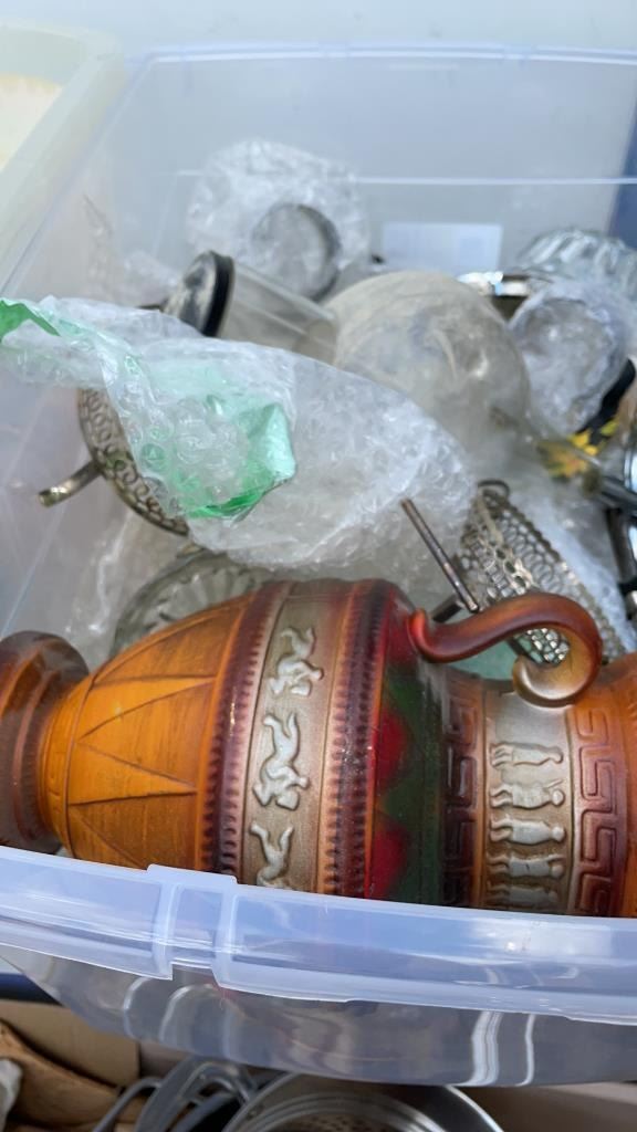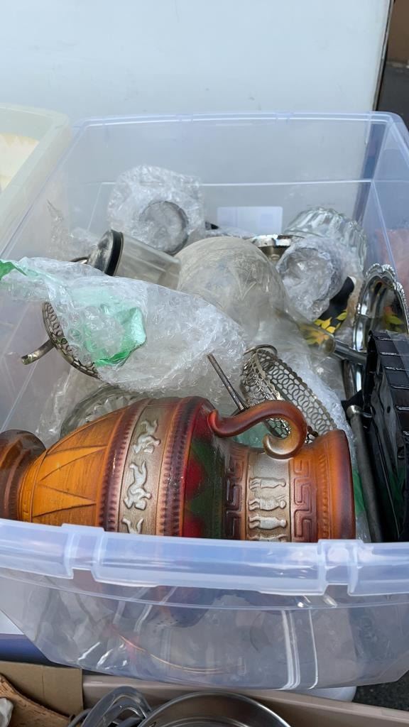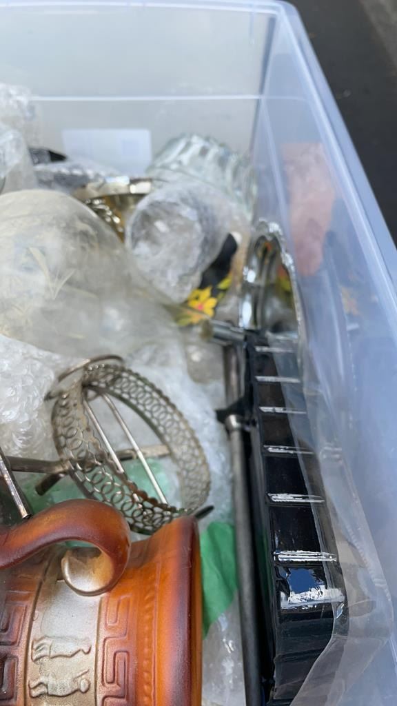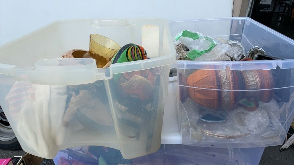 2 TOTES OF FIGURES, SILVER PLATE, ESTATE GOODS