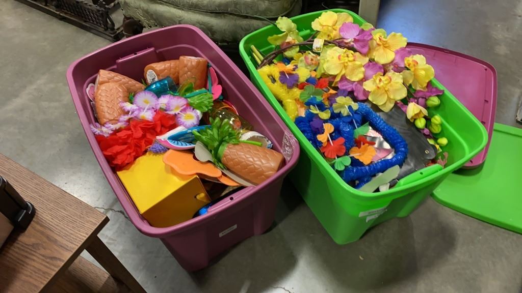 2 TOTES OF HAWAIIAN PARTY DECORATIONS