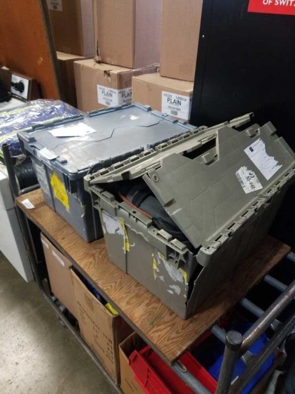 2 TOTES OF STEEL TOED WORK BOOTS AND STEEL TOE RUBBER BOOTS