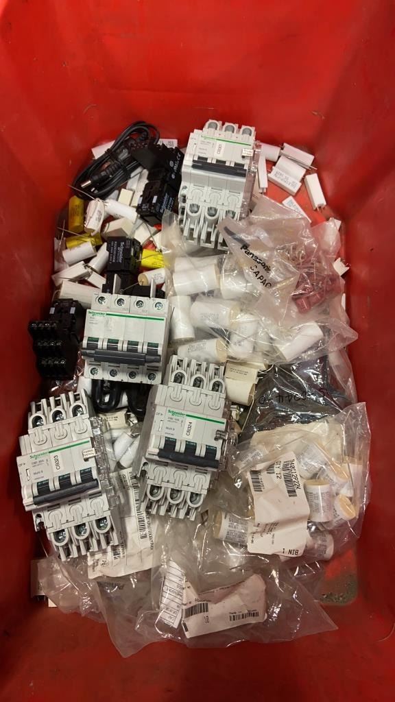 2 TOTES OF TERMINAL BLOCKS, BREAKERS, DIN RAIL AND MORE